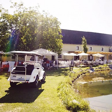 Außerdem wird jeder Golferin und jedem Golfer nicht nur beim Golfen einer der schönsten Ausblicke in der Umgebung gewährt - sondern auch noch nach 9 Löchern, beim wohlverdienten kulinarischen Abschluss auf der wunderschönen Terrasse des Clublokals „Karlingberger Gut“ am Rande des 8.000 m² großen Teichs.